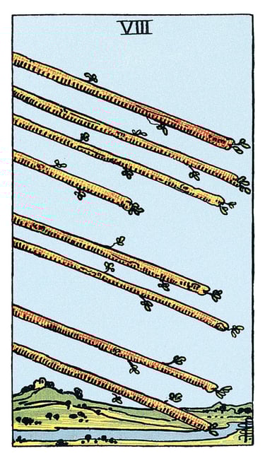 Anfang diesen Jahres legte ich mit Tarot-Karten ein Jahresrad mit einer Monatskarte für alle zwölf Monate. Karten, deren Energie und Impuls sich in jeweils dem entsprechenden Monaten zeigen sollten. Für den Monat Juli war es die Acht der Stäbe. Auf dieser Karte sind acht fliegende Stäbe zu sehen. Stäbe stehen für Feuerenergie, sind Impulse, Aktionen, Handlungen oder wahrer innerer Wille. Diese Stäbe des Willens und der Aktion auf dieser Karte sind geworfen worden und befinden sich nun im Landeanflug. Sie fliegen alle parallel - synchron - zueinander, sie werden bald landen. Es ist keine Person zu sehen. Was du hinausgeschickt hast, wird nun zu dir zurückkehren - ganz von alleine.